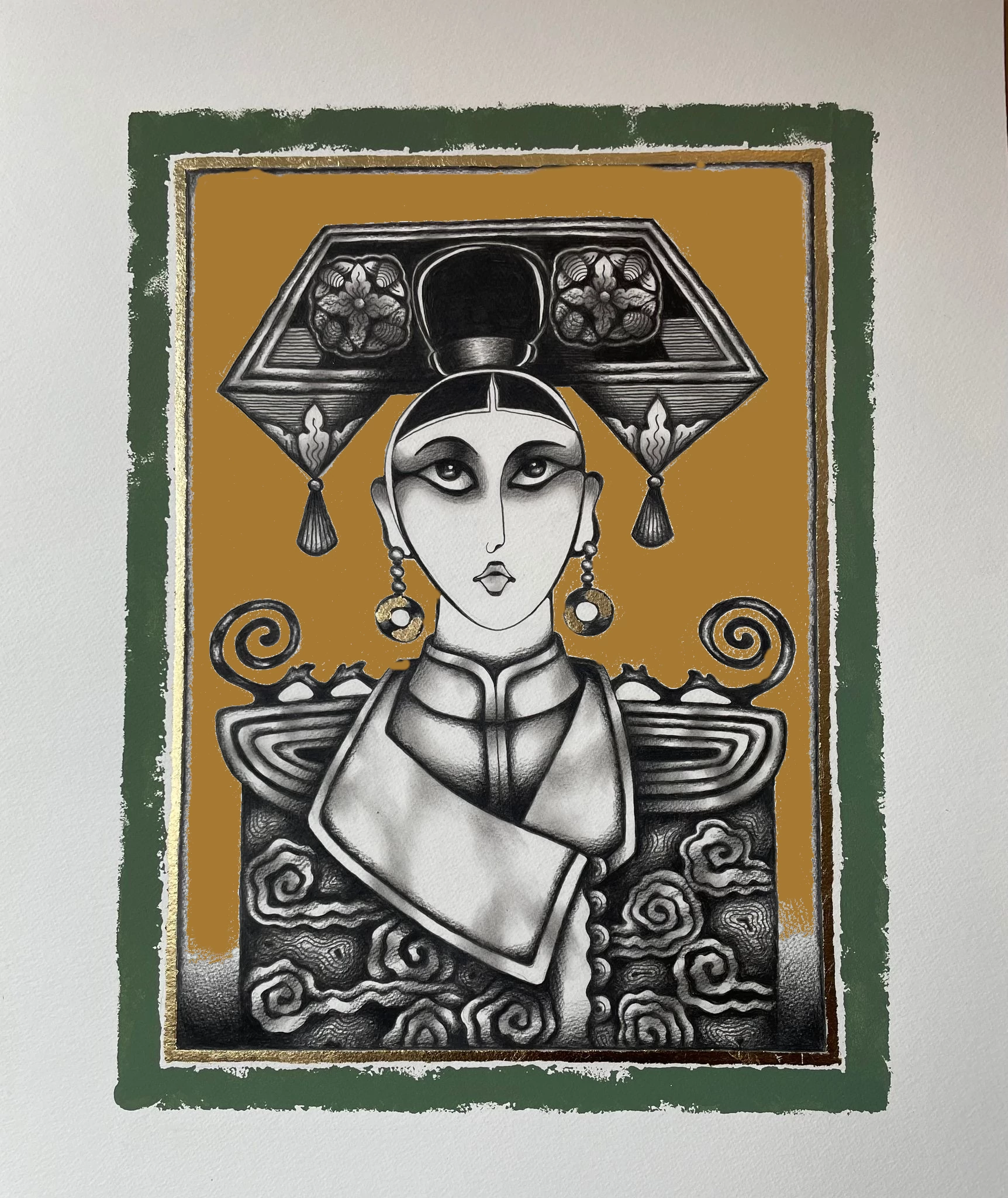 High quality fine art print of the original work.With hand coloured background, border and banded with gold leaf.