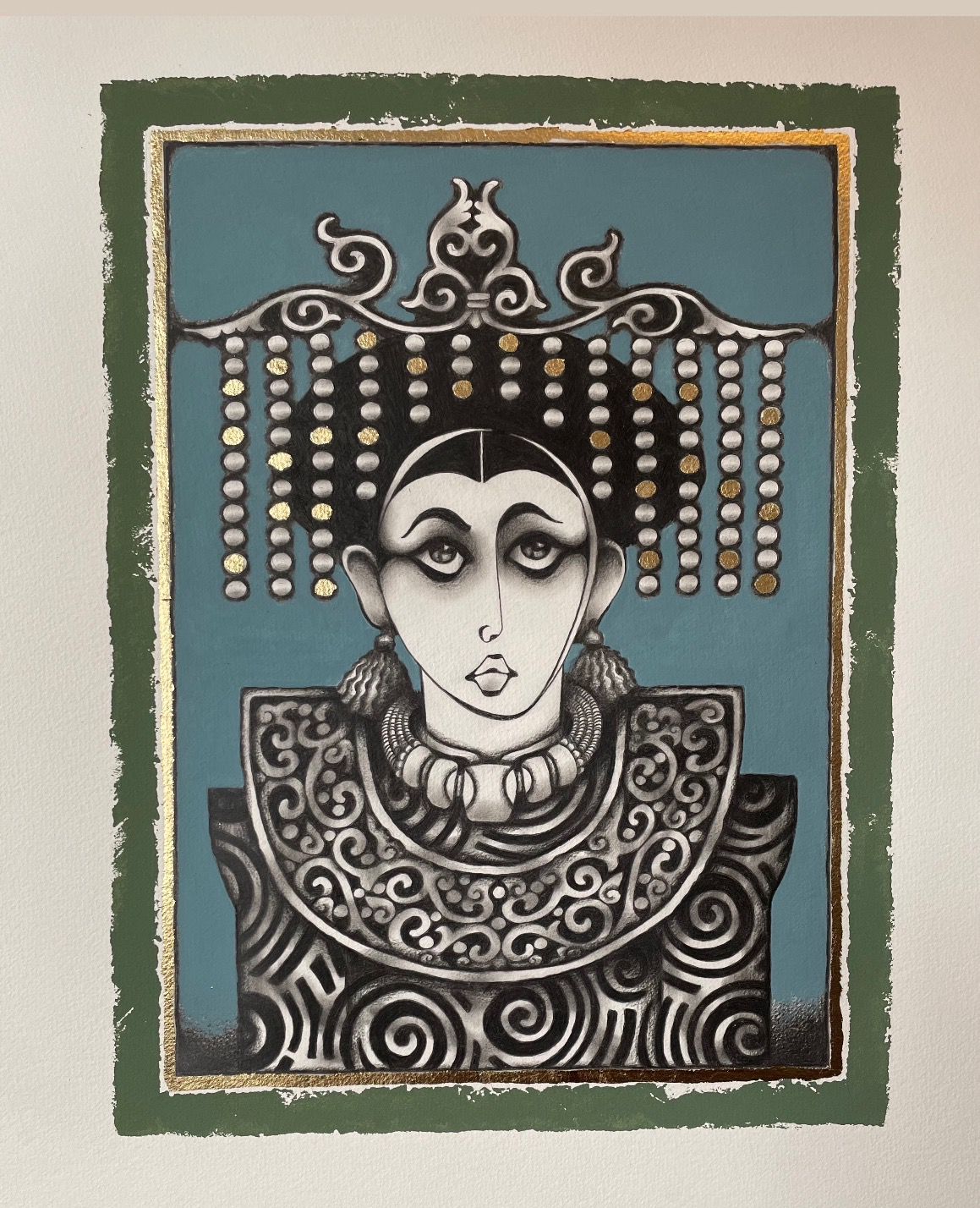 High quality fine art print of the original work.With hand coloured background, border and banded with gold leaf.