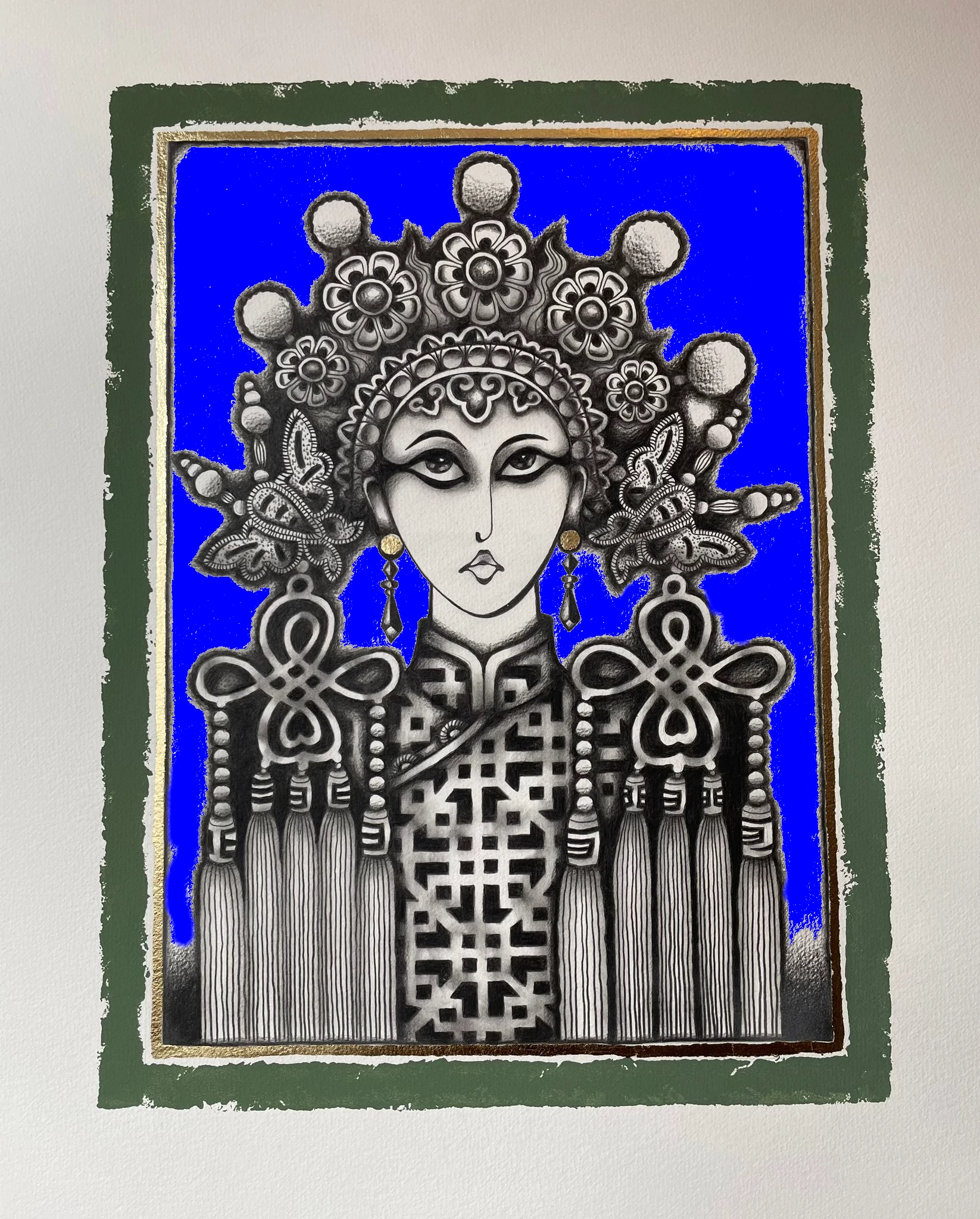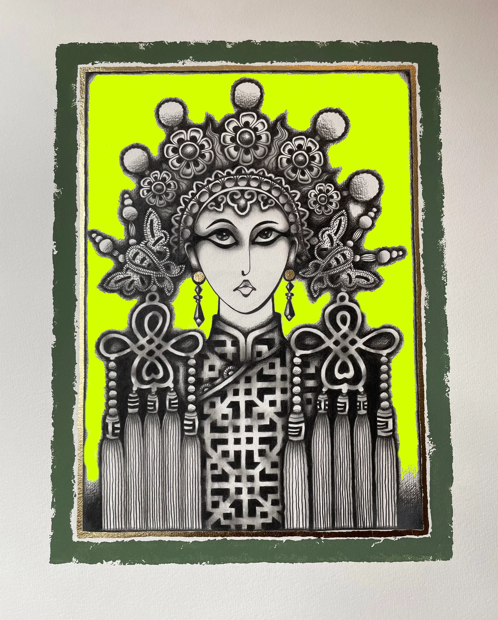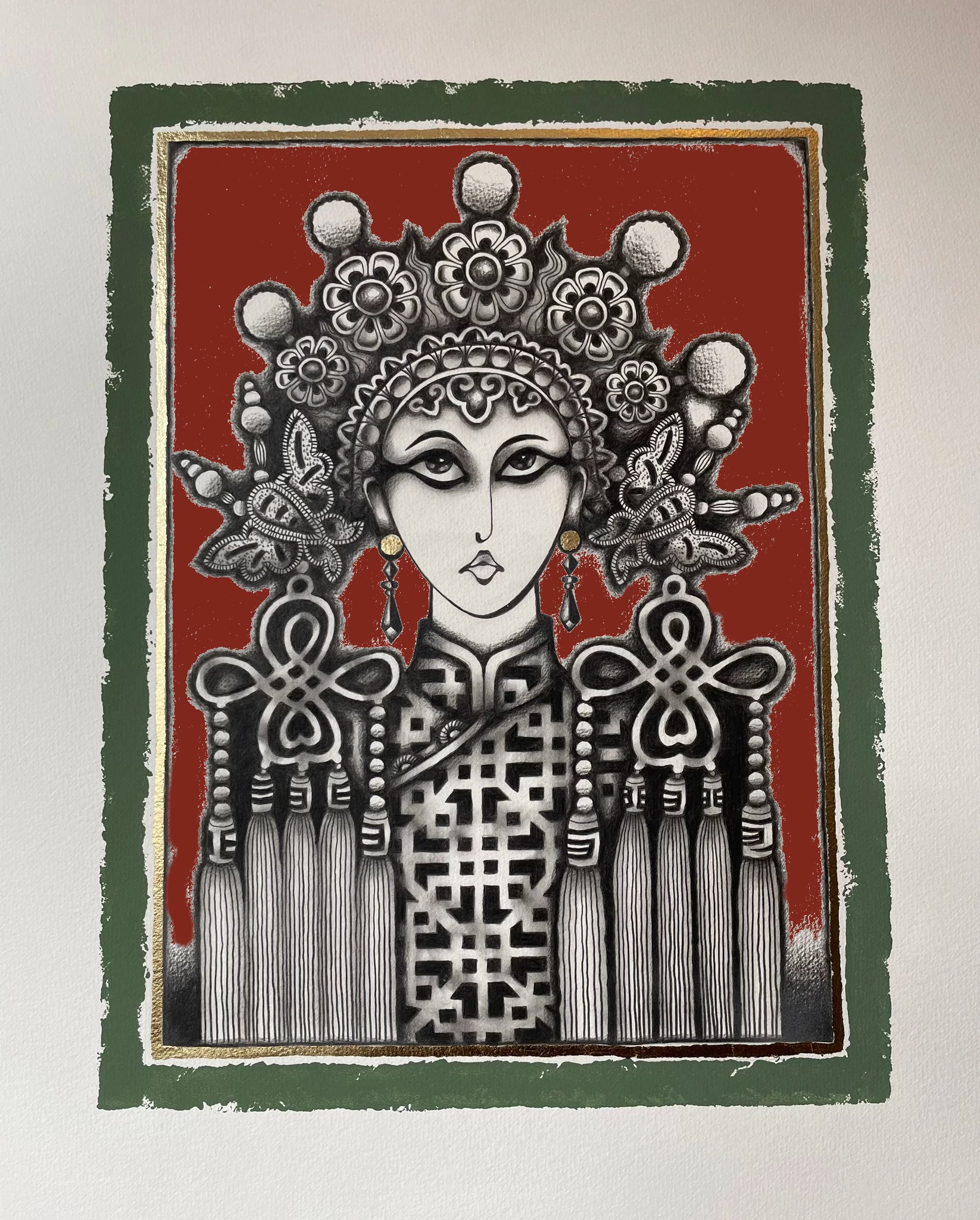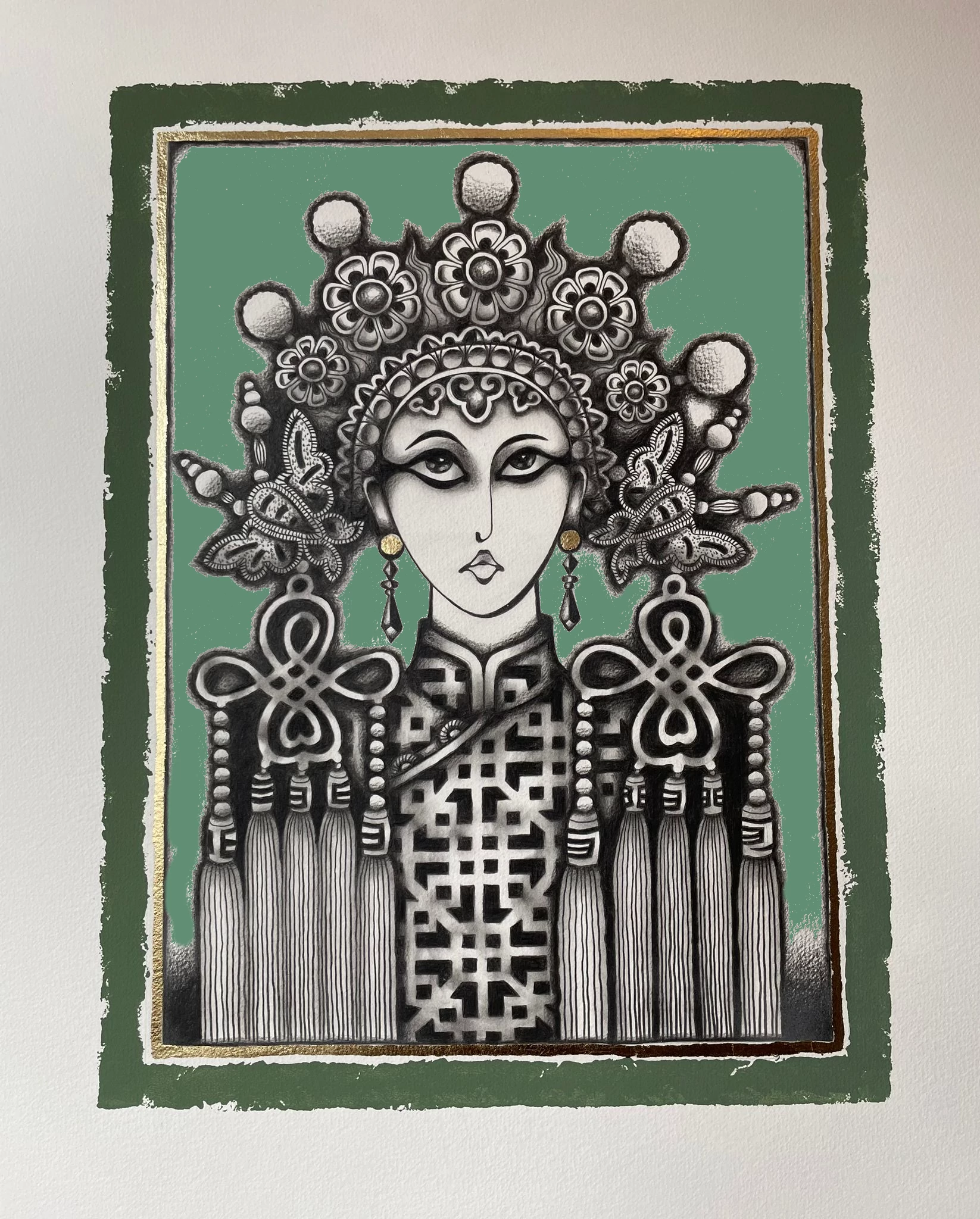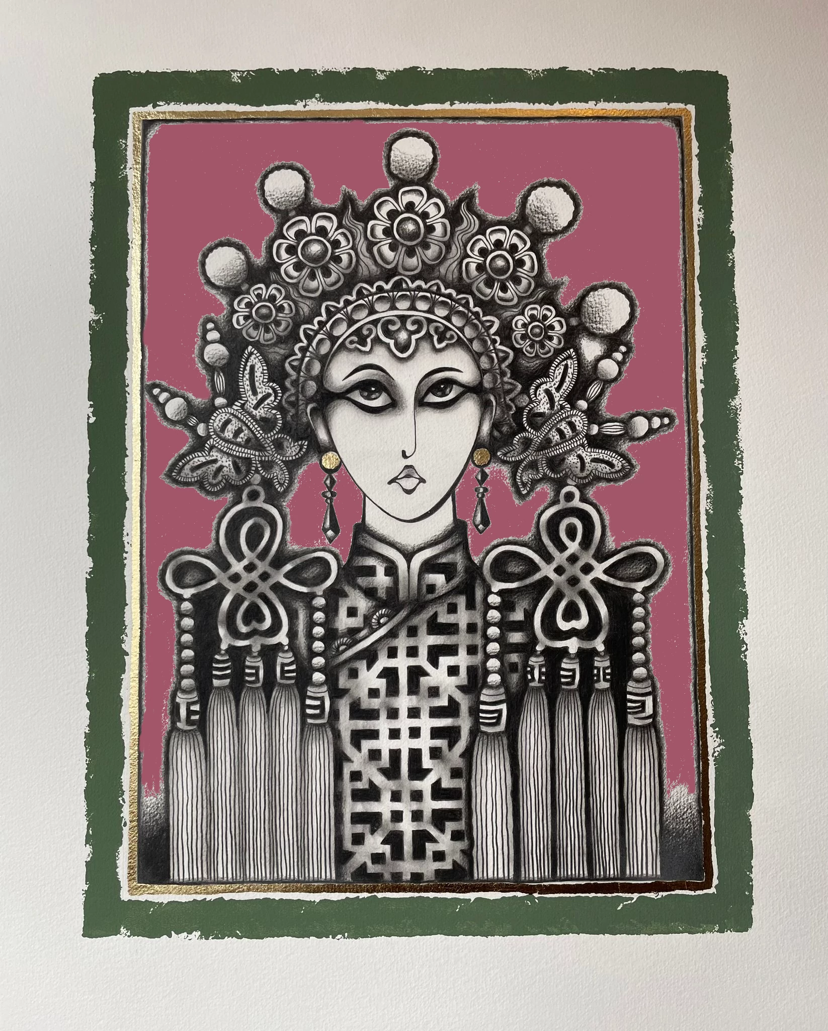 High quality fine art print of the original work.With hand coloured background, border and banded with gold leaf.