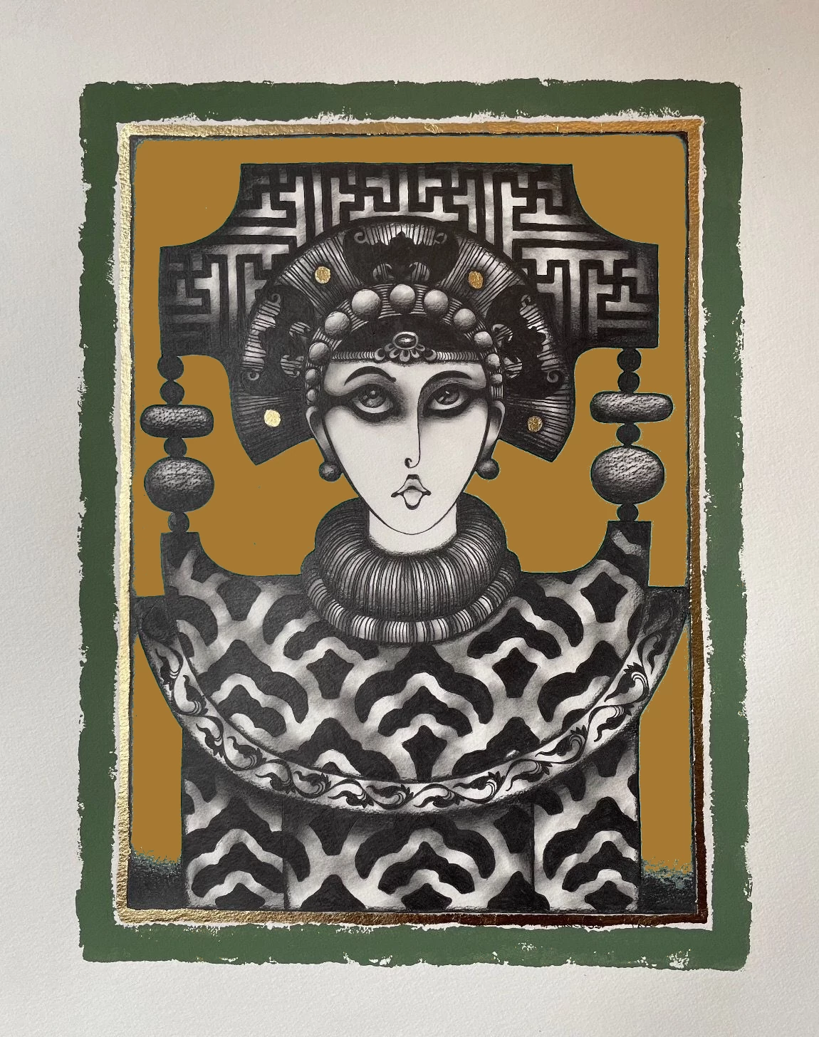 High quality fine art print of the original work.With hand coloured background, border and banded with gold leaf.