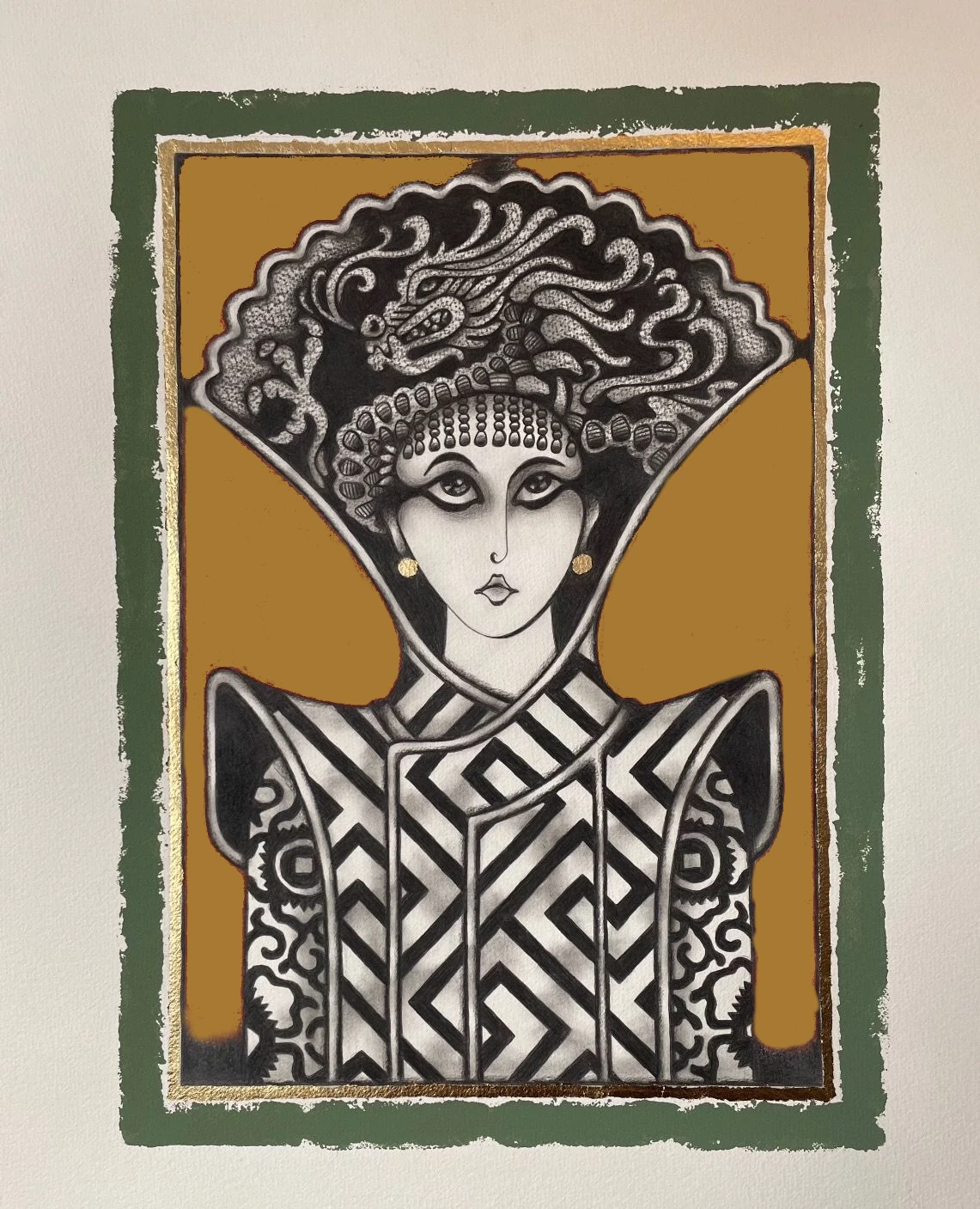 High quality fine art print of the original work.With hand coloured background, border and banded with gold leaf.